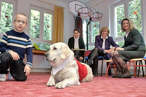 Az ezt követő percekben Makray Katalin a szomszéd teremben zajló állatasszisztált terápiát szemrevételezte, ahol Shony, a négylábú doktor – fajtáját tekintve golden retriver – segített a gyerekeknek a fejlődésben.