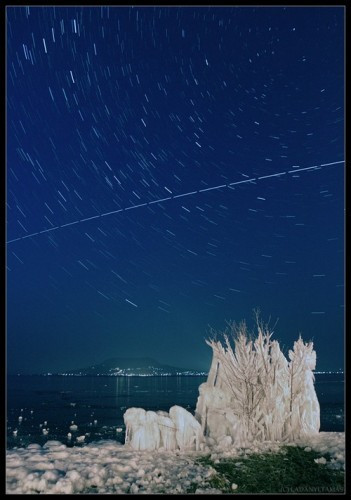 Február 24-én utoljára indították Föld körüli útra Floridából a Discovery űrrepülőgépet, amely két nappal később csatlakozott az ISS nemzetközi űrállomáshoz. Az első napon azt láthattuk, hogy a Discovery fénylő kis „csillagként” követi az égen az ISS-t, majd a sikeres dokkolás után együtt folytatták útjukat. Amikor az időjárás engedte, az alkonyati órákban többször is megfigyelhettük az űrpáros átvonulását. A képhez a magyar tenger déli partjának bizarr jégalakzatai adták a díszletet, a háttérben a Badacsony jellegzetes sziluettje is látható.