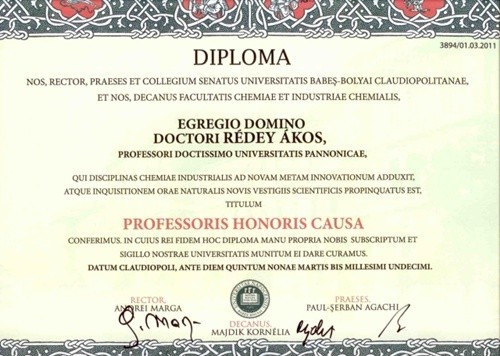 Rédey Ákos a kitüntetést a kémiai és környezetmérnöki tudományok területén kifejtett munkásságának elismeréseként vehette át. A címet dr. Andrei Marga rektor 2011. március 3-án ünnepélyes keretek között adta át Kolozsvárott.
