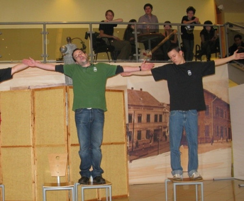 – Az improvizáció lényege, hogy nem cáfolhatunk rá egymásra, mert akkor nem tud felépülnia a jelenet. Mi ebben vagyunk ügyesek. Jó alapötletet nehéz kitalálni, mivel nem a klisékkel teli történetek a befutók, hanem a zseniálisak. A nézőnek azonnal tudnia kell, mi történik a színpadon. Például, ha három ember föláll úgy, hogy a kezük oldalsó középtartásban van, a fejüket kicsit oldalra biccentik, akkor egyértelmű, hogy Krisztust látják a kereszten a jobb és a bal latorral. Nem kell hozzá plusz szöveg. Itt, a fesztiválon olyan jelenetek a jók, amelyeket a történelemből, a Bibliából merítünk, amelyeket nem kell magyarázni. Ebből akármi kisülhet – mondta el Dobosi Ádám.