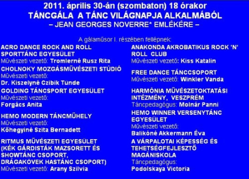 Április 30-án, szombaton este hat órától a gálaműsor első részben helyi tánccsoportok szórakoztatják a közönséget, majd a pápai Rebel-Lion Tánc-Sport Egyesület mutatja be modern tánc repertoálját.