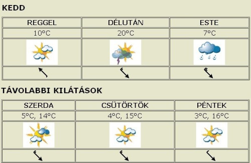 Kedden eleinte még számíthatunk némi napsütésre, majd nyugat felől megnövekszik a felhőzet, hidegfront érkezik. Zápor, zivatar is kialakulhat. Az eleinte gyenge délekelti szél a front érkezésekor északnyugatira fordul és megerősödik. A hőmérséklet reggel 10°C, délután 20°C körül ígérkezik, este azonban már csak 7°C valószínű.