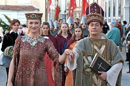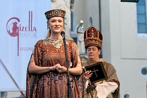 A Veszprém Városi Cigányzenekar műsora, valamint Viszt Péter és vendégei előadásában megszólaltatott magyar nótákat követően pénteken délután megérkezett a Várszínpad pódiumára Gizella királyné és István király.