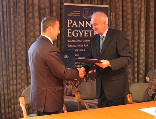 A tájékoztatókat követően Dr. Kovács Zoltán Veszprém megyei kormánymegbízott és Dr. Rédey Ákos, a Pannon Egyetem rektora aláírta a két szervezet stratégiai együttműködéséről szóló megállapodást, majd a dokumentumot ellátta kézjegyével az egyetem gazdasági főigazgatója, Zsiborácsné Petró Mária is.