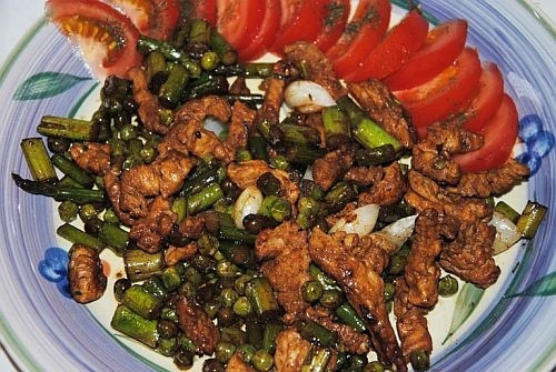 Fejenként két (tenyérnyi és kiklopfolt) vékony szelet pulykamellfilét felcsíkozunk, megforgatjuk fekete szójaszószban. Nagyobb serpenyőben jobb fajta olívaolajat forrósítunk, ebbe dobjuk a csíkokat, megforgatjuk őket.