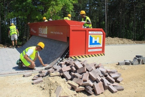 Az ország első útterítő gépe a veszprémi állatkert bekötő útján rakja le a térkőburkolatot, a kezelők segítségével. A veszprémi Gördülő Kövek elnevezésű építőipari szakkonferencián működés közben mutatták be a gépet, amely naponta több száz négyzetméternyi térkövet tud lerakni.