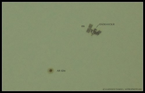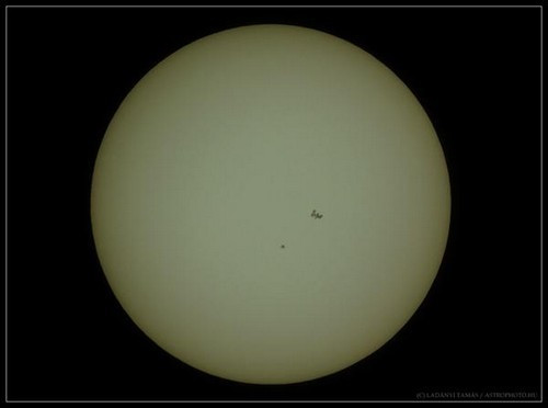 A földön 4,4 km széles sávban figyelhettük meg a jelenséget, és - fotós szemmel nézve - igencsak résen kellett lenni, ugyanis az áthaladás 0,35 másodpercig tartott. Veszprémből a Castor csillagvizsgálóból követve az eseményeket azt a pillanatot sikerült lencsevégre kapni, amikor az űrjárművek az AR 1216 számú napfolt közelében haladtak el. Bár a körülmények távolról sem voltak ideálisak - ugyanis vékony cirruszfehőzet borította az eget - a sikeres képen azonosíthatóvá váltak az űreszközök egyes részletei is. Érdekes, hogy még a napfoltmaximum felé közeledve is milyen szegényes mostanában a Nap felszíne; mindössze egy nagyobb folt árválkodott a korongján.