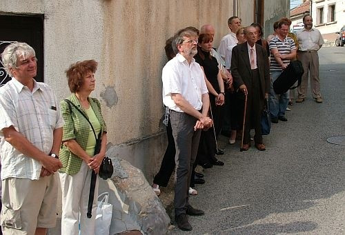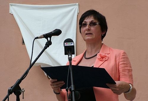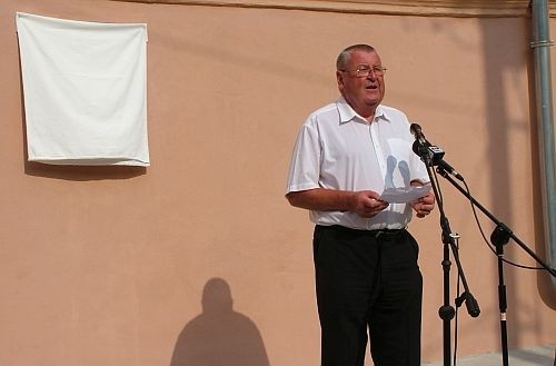 A méltató beszédek után aztán zuhogó esőben leplezte le az emléktáblát, és helyezte el koszorúját Veszprém alpolgármestere.