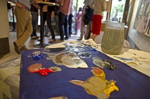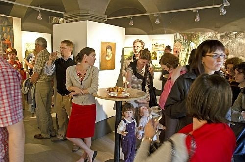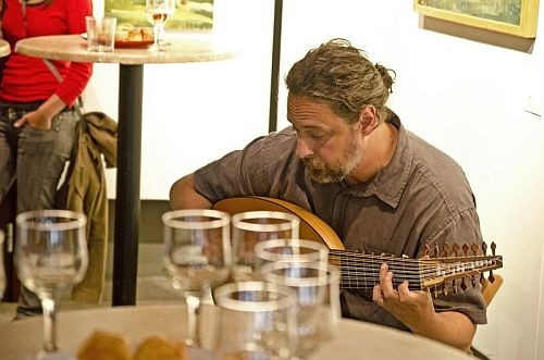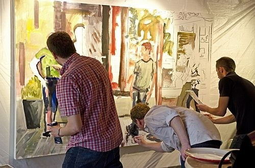 De itt se a szokványos képbemutatóra gondoljunk, bár az is volt, hanem egy egész falat betöltő közös képfestésre. Amíg a három Pécsett végzett művész egymást kiegészítve, segítve dolgozott, lehetett velük beszélgetni, vagy Nagy Csaba lantművész olasz dallamait figyelni, avagy finom villányi borokat kóstolni. Vagy éppen mindhármat.