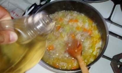 Hozzádobtam egy apróra vágott vöröshagymát, három kockázott zsenge répát, egy kisebb zellergyökeret (a Mester kedvence volt), egy karalábét, pár gerezd fokhagymát, meg pár marék darabolt újhagymát.