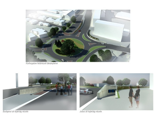 A Jutasi-Budapest utca kereszteződésében megépülő körforgalom nem csak az átvezető utakat foglalja magába, hanem a Hotel előtti parkolóhoz is csatlakozást garantál – ismertette Jankó Tamásné, a Pannon Terv Veszprém Kft. közlekedéstervezője. Elmondta, külön forgalmi sáv biztosítja majd a közlekedést a Budapest útról a Jutasi útra kanyarodóknak, valamint a Jutasi útról a Hotel felé haladóknak, ami tehermentesíti majd a körpályát. A gyalogos közlekedés aluljáró segítségével történik.