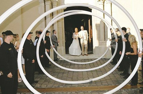 Tűzoltótömlőkből emeltek kaput a párnak