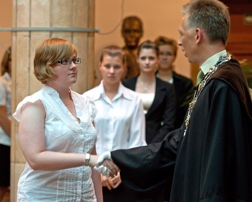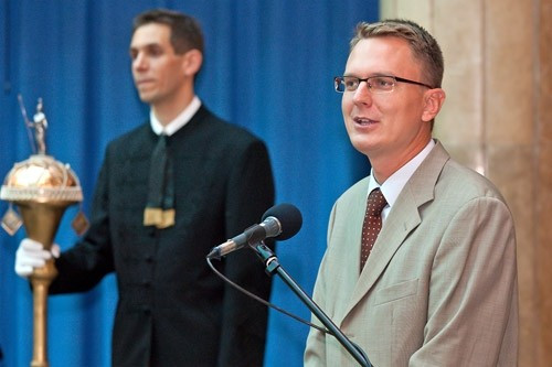 A tanévnyitó ünnepély eskütétellel zárult, ahol a Gazdaságtudományi Kar dékánja kézfogással egyetemi polgárrá fogadta az elsőéves hallgatókat.