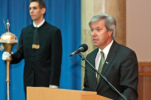 Dr. Rétvári Bence, a Közigazgatási és Igazságügyi Minisztérium parlamenti államtitkára ünnepi köszöntőjében kihangsúlyozta, hogy bármelyik befektetésünk elértéktelenődhet, azonban a tudás mindig megőrzi értékét. Elmondta, hogy az új felsőoktatási törvény célja, hogy a vidéki egyetemeket is megerősítse, valamint a műszaki és természettudományos képzést magasabb színvonalra emelje. Az egyetemi képzés szabadabb képzés, így arra bíztatta az elsőéves hallgatókat, hogy aktívan vegyenek részt az egyetem tevékenységében.