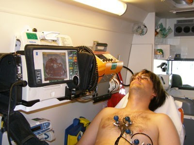 Dr. Valastyán Péter, Zsigmond István és Vámosi Róbert mentősök készségesen felajánlották, bemutatják, hogyan készül az EKG. A test több pontján, a csuklókon, a bokán és a mellkason elhelyezett érzékelők segítségével 2 perc alatt analizálja a műszer a szív ritmusát, ennek alapján dönt az orvos a szükséges beavatkozásról.