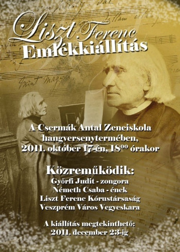Liszt Ferenc születésének 200. évfordulójára emlékezve és tisztelegve munkássága előtt emlékkiállítás nyílik a Csermák Antal Alapfokú Intézmény hangversenytermében, október 17-én, hétfőn 18 órakor. A budapesti Liszt Ferenc Emlékmúzeum gondozásában készült tablósorozatot adományként kapta a veszprémi zeneiskola.