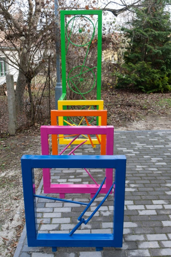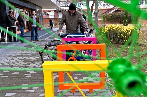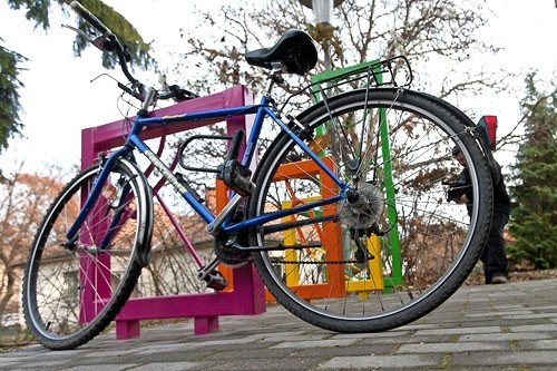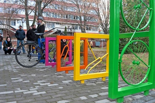 A különböző színekben pompázó alkotás gyakorlati funkciója mellett esztétikai élményt is hordoz, így az ember szinte kedvet kap a kerékpározáshoz. Veszprémben azonban egyelőre még csak egy helyen parkolhatjuk le kétkerekűnket alkatrészekből készült tárolónál, ehhez pedig a Pannon Egyetem menzájához kell gördülnünk.