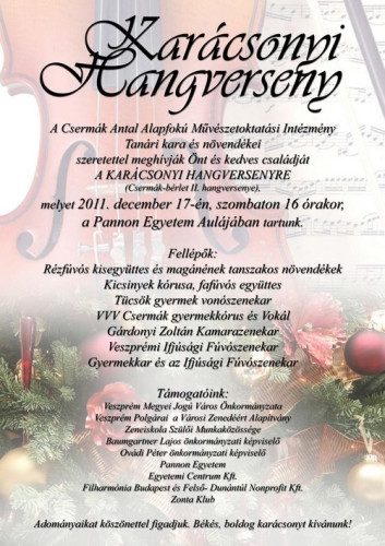 A 95 éves múltra visszatekintő veszprémi Csermák Antal Alapfokú Művészetoktatási Intézmény hagyományos karácsonyi hangversenyét 2011. december 17-én (szombaton) 16 órától tartja a Pannon Egyetem aulájában.