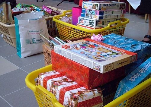 A veszprémi gyerekek (összesen 12 iskolából) zömében játékokat és könyveket ajánlottak fel: plüssöket, autókat, legót, társasjátékot, mese- és foglalkoztató könyveket. Voltak, akik színes papírokba, dobozokba csomagolták – és még azt is ráírták, hány éves gyermeknek szánják.