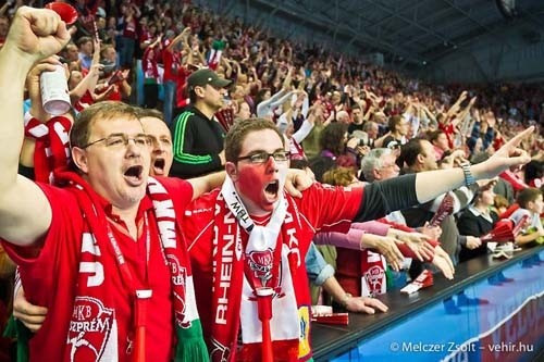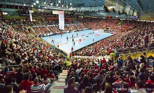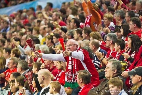 16:50: "Veletek vagyunk" - üvöltik a drukkerek. A szlovén játékvezető páros után a vendégeket mutatta be a "szpíker". Az egykori veszprémi kapus zseni Sterbik óriási tapsot kaptt, nem úgy Dusebajev edző, akit kifütyülte a publikum.