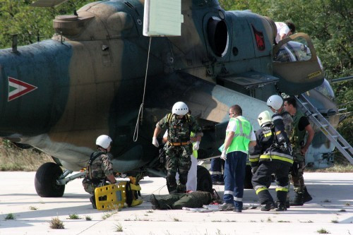A mentőfeladatokban részt vett az Országos Mentőszolgálat, a Légimentő Kht. Illetve a katasztrófavédelem kijelölt erői. Az oltást követően vákum matracokban, és speciális hordágyakon vitték a sérülteket az öt szállítóhelikopterhez. Míg a magyarok egy Mi-8 és egy Mi-17, valamint egy civil mentőhelikopterrel szállítottak (az előbbiekbe 3-4, míg a civil gépbe mindössze egy súlyos sérült fér – szerk.), a törökök és a szlovének COUGAR-ral. A gyors elsősegély nyújtást, majd a kimentést Mi-24 harci helikopterek és a rendőrség helikoptere biztosította. A 17 katona elszállítása, majd a terület megtisztítása összesen nem vett igénybe 20 percet. Így mondhatni, hogy gyors, hatékony, profin reagáló különleges egységek mutatkoztak be az elöljárók előtt. A négy szállítógép a „0” pontról tovább repült Pápa Bázisreptérre, ahol egy úgynevezett ROL1 sátorban, teljesen felszerelt, mobil minikórházban választották szét a sérült katonákat, akiket a koordinációs központtól kapott utasítás alapján a Veszprém megyei, a győri, a pápai és budapesti kórházba szállítottak.