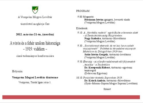 A fehér és a vörös uralom hátországa - 1919 vidéken címmel tartanak tudományos konferenciát a Veszprém Megyei Levéltárban szerdán, március 21-én.