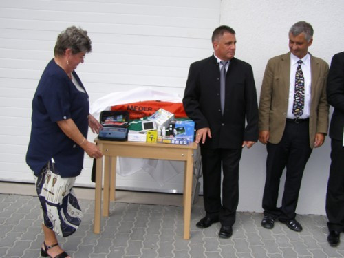 Az ünnepségen ajándékok átadására is sor került. A 04 Alapítvány képviseletében dr. Rozsnyói Edit kuratóriumi elnök félautomata defibrillátort, navigációs készüléket, különböző műszaki eszközöket adott át az új állomás vezetőjének, Barabás Zoltánnak. Az elnök emlékeztetett arra, hogy az országban elsőként Veszprém megyében látták el a mentőautókat félautomata defibrillátorral.