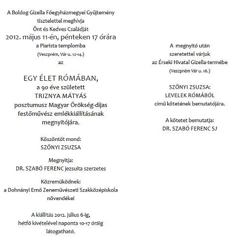 Május 11-én, pénteken 17 órakor nyílik a Piarista-templomban Triznya Mátyás posztumusz Magyar Örökség Díjas festőművész emlékkiállítása.