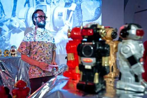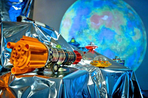 A most kiállított darabok az ’50-es években gyökeredző „űrkorszak” tipikus tárgyai, a robotok, űrhajók és holdjárók így egymás mellett a megtestesült űrversenyt és a képzeletbeli jövőbe vetet – leginkább gyermeki – hitet vannak hivatva megjeleníteni.