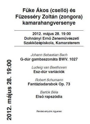 Fűke Ákos (cselló) és Füzesséry Zoltán (zongora) 2012. május 28-án, hétfőn 19 órakor ad koncertet a Dohnányi Ernő Zeneművészeti Szakközépiskola kamaratermében.