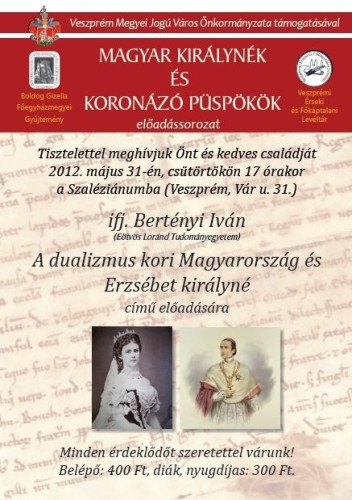 Május 31-én, csütörtökön 17 órakor ifj. Bertényi Iván tart előadást a Szaléziánum épületében „A dualizmus kori Magyarország és Erzsébet királyné” címmel.