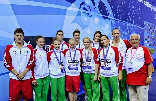A magyar csapat tagjai, akik a május 24-i versenynapon érmet szereztek a 31. úszó Európa-bajnokságon, a Debreceni Sportuszodában Kiss László szövetségi kapitány (j) társaságában: Gyurta Dániel, Hosszú Katinka, Kapás Boglárka, Biczó Bence, Mutina Ágnes, Bohus Richárd, Verrasztó Evelyn, Jakabos Zsuzsanna, Risztov Éva, Cseh László (b-j). MTI Fotó: Illyés Tibor