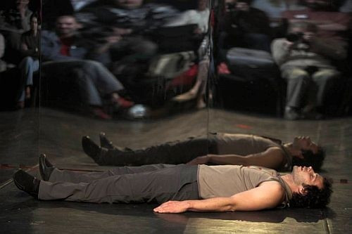 Az Alibiben a háttérben (a tükörfal mögött) zajlanak a lényegi dolgok; ott történik meg mindaz, amiről ebben a sokbeszédes műben nem ejtenek egyetlen szót sem. A szorongás (angst), a szerelem, az eltemetett-titkos vágy a tárgya a gyönyörűen koreografált, lírai duóknak – írja Horeczky Krisztina: Csodálatos elme című cikkében. Valóban, ez a sokféleképp megvilágítható tükörfal az előadás nagy ötlete, az arc és a mellé-mögé vetített másik személyiség, a sohasem megfogható, megérinthető másik, a pár hiányzó tagja. Ez hordozza a darab lírai, kozmikus üzenetét.