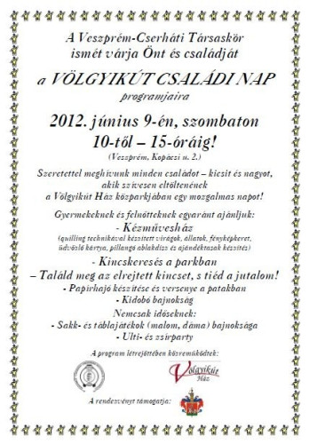 2012. június 9-én, szombaton 10 órától 15 óráig családi napot rendez a Cserháti Társaskör a Völgyikút Ház parkjában.