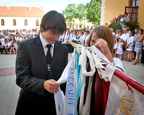Az ünnepségen a nyolcadikosok képviselői felkötötték az évfolyamot jelképező szalagot az iskola zászlajára.
