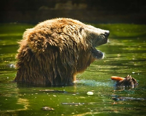 Barnamedvéink, Kata és Bori a nagy melegben gondozóiktól fagyasztott gyümölcsöket is kaptak megszokott takarmányuk mellé, illetve a kifutójukban kialakított medencében szeretik hűteni magukat.