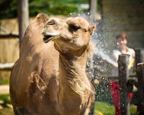 A sivatagi hőséget jól tűrő dromedárok nagyon szeretik, amikor gondozóik vízsugárral locsolják testüket, sőt, még az ekkor keletkezett tócsákban is szívesen dagonyáznak.