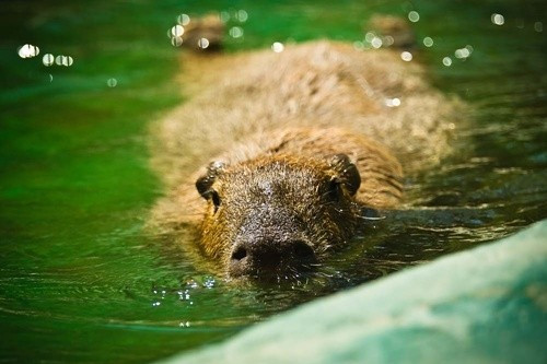 A világ legnagyobb rágcsálói, a kapibarák szívesen lubickolnak a tőkés récék társaságában a nyár elején teljesen felújított Nagy tó kifutóban. A kapibara család télen született apróságai csak „szülői felügyelettel” használhatják a medencét, de így is rendkívül élvezik a felfrissülést.
