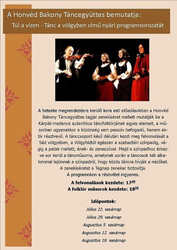 A Honvéd Bakony Táncegyüttes július 22-től hetente 17.30-tól néptánc előadásokat tart a veszprémi Séd-völgyben.