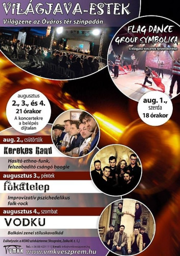 Augusztus 1-től 4-ig 21 órás kezdéssel világzenei koncertek zajlanak a Flag Dance Group Symbolica, a Kerekes Band, a Fókatelep és a Vodku együttesek közreműködésével az Óváros téren.