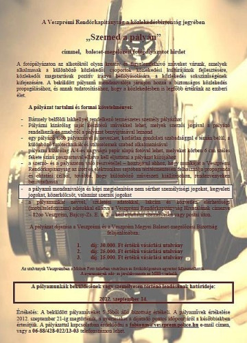 A Veszprémi Rendőrkapitányság a közlekedésbiztonság jegyében „Szemed a pályán” címmel baleset-megelőzési fotópályázatot hirdet.