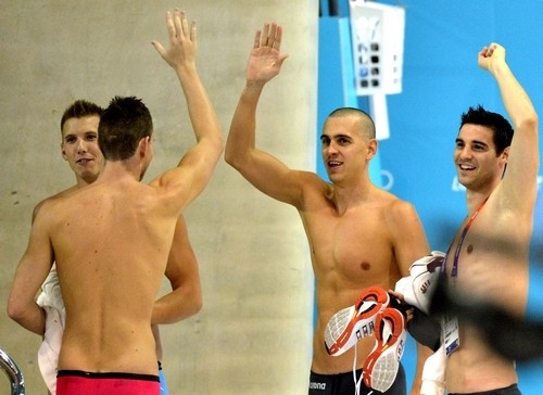 Balról: a magyar váltó tagjai, Kozma Dominik, Bernek Péter (háttal), Cseh László és Kis Gergő
