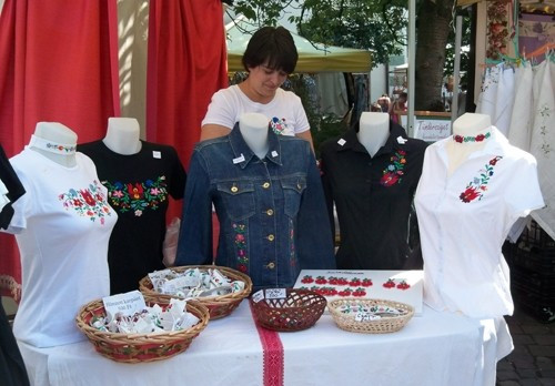 Persze nem hiányozhattak a manapság divatos népi motívumok sem. Kesziné Simon Barbara 16 éves kora óta foglalkozik hímzéssel, azonban csak mostanában készít matyó mintával díszített, modern, fiatalok által is bátran viselhető ruhadarabokat. Elmondta, a népi motívumos öltözékekre az utóbbi időben nagy a kereslet; ezt már előző látogatásakor, a májusban rendezett Gizella napokon is tapasztalta.