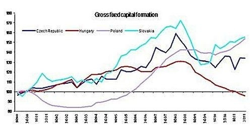 Az ábrán a visegrádi országokban történt beruházások nagyságát kísérhetjük figyelemmel 2000 óta, féléves bontásokban. Jól látható, hogy a bordó vonallal jelölt Magyarország sokáig az élmezőnybe tartozott, majd a 2004-es év második felétől elkezdett leszakadni a régió többi országától. A 2008-as év elejétől pedig drámai módon csökkent a beruházások nagysága hazánkban. 2011-ben a szlovák és lengyel beruházások növekednek, a cseh stagnál, a magyar pedig zuhan.