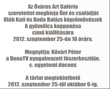 Oláh Kati és Boda Balázs képzőművészek A gyümölcs koppanása című kiállítása látható szeptember 25-e, keddtől az Óváros Art Galériában.