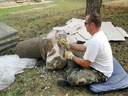 Csirke Orsolya régész szerint a jellegzetes helyi nyersanyagból, vörös homokkőből faragott oszloptöredék valószínűsíthetően környékbeli műhelyben készült. A 40 x 40 cm-es lábazatot a négy sarkán stilizált levélmotívum díszíti, felül egy szélesebb gyűrűvel válik el magától az oszloptörzstől, amelynek átmérője 33 cm. A múzeumi igazgatóság régészeti gyűjteményében több, hasonló megmunkálású, díszítésű töredék található. A római korból Balatonalmádi és Révfülöp környékéről ismertek művelés alatt levő, permi homokkőbányák. A balácai lapidárium (kőtár) kőemlékeinek természettudományos vizsgálata a Balaton-felvidéki római kori bányák és műhelyek kereskedelmi kapcsolatáról tájékoztat bennünket a bányákból nyersanyagként vagy (fél)kész áruként forgalomba került faragványok alapján.