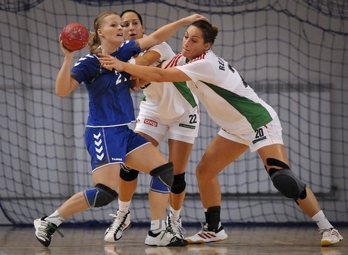 Az ukrán Anna Redka (b), Bódi Bernadett (k) és Rédei-Soós Viktória (j) harcol a labdáért