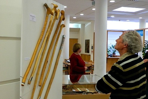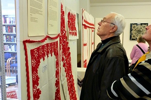 A könyvtár kisgalériájában kiállított munkák között hímzést, csipkét és faragványokat is láthatnak az érdeklődők.