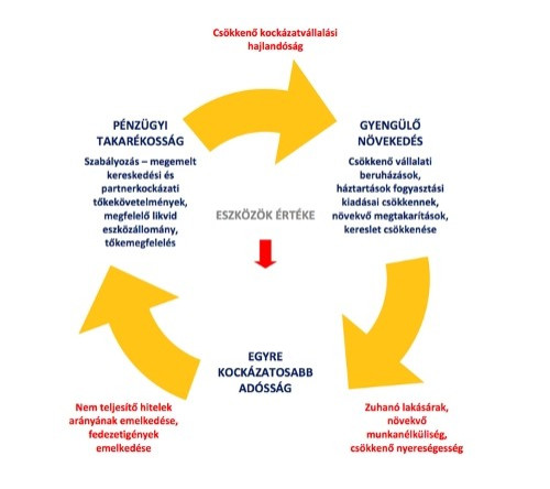 Íme, egy ábra arról, hogy hogyan hat a hitelezés zsugorodása a fogyasztókra, a reáleszközök értékére, valamint a növekedésre. És ami a legfontosabb, hogy a visszacsatolásokon keresztül erősödik fel és válik megfékezhetetlennek.