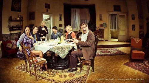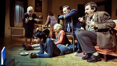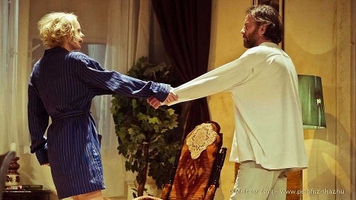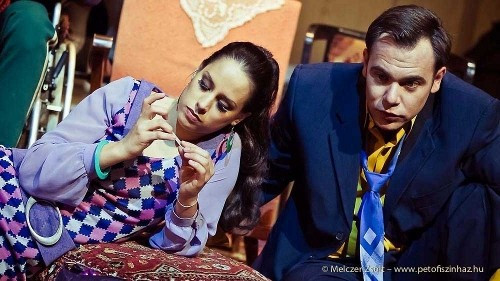 Menő retró szoba (díszlet: Perlaki Róbert), amíg el nem kezdődik a darab, kedvére kigyönyörködheti magát az ember a berendezési tárgyakban, ilyen szobát már láttam, pont ilyet és pont így – valahogy ez az érzése mindenkinek.